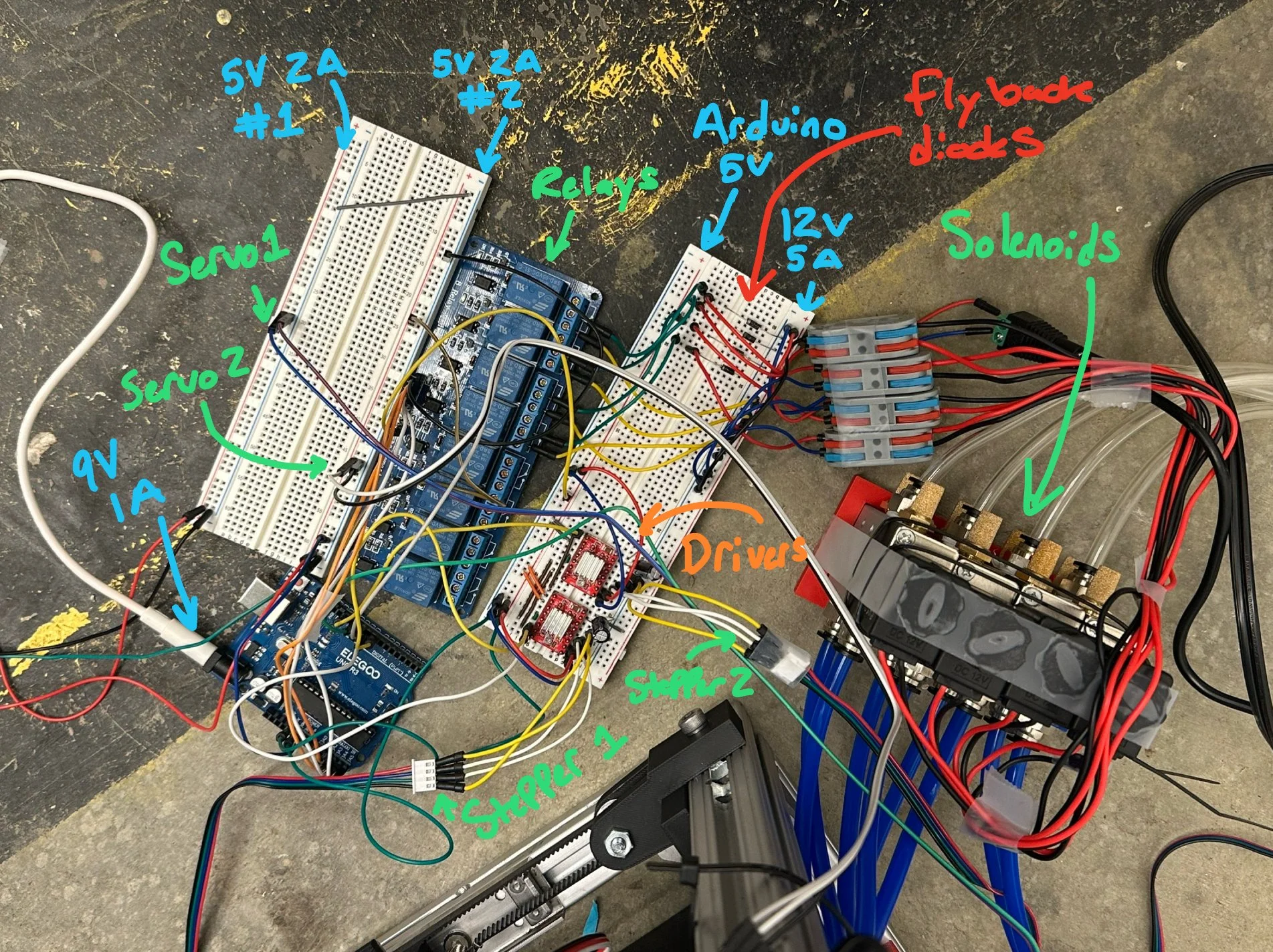 9V-1A powers arduino, arduino 5V connects to drivers and relay board components.