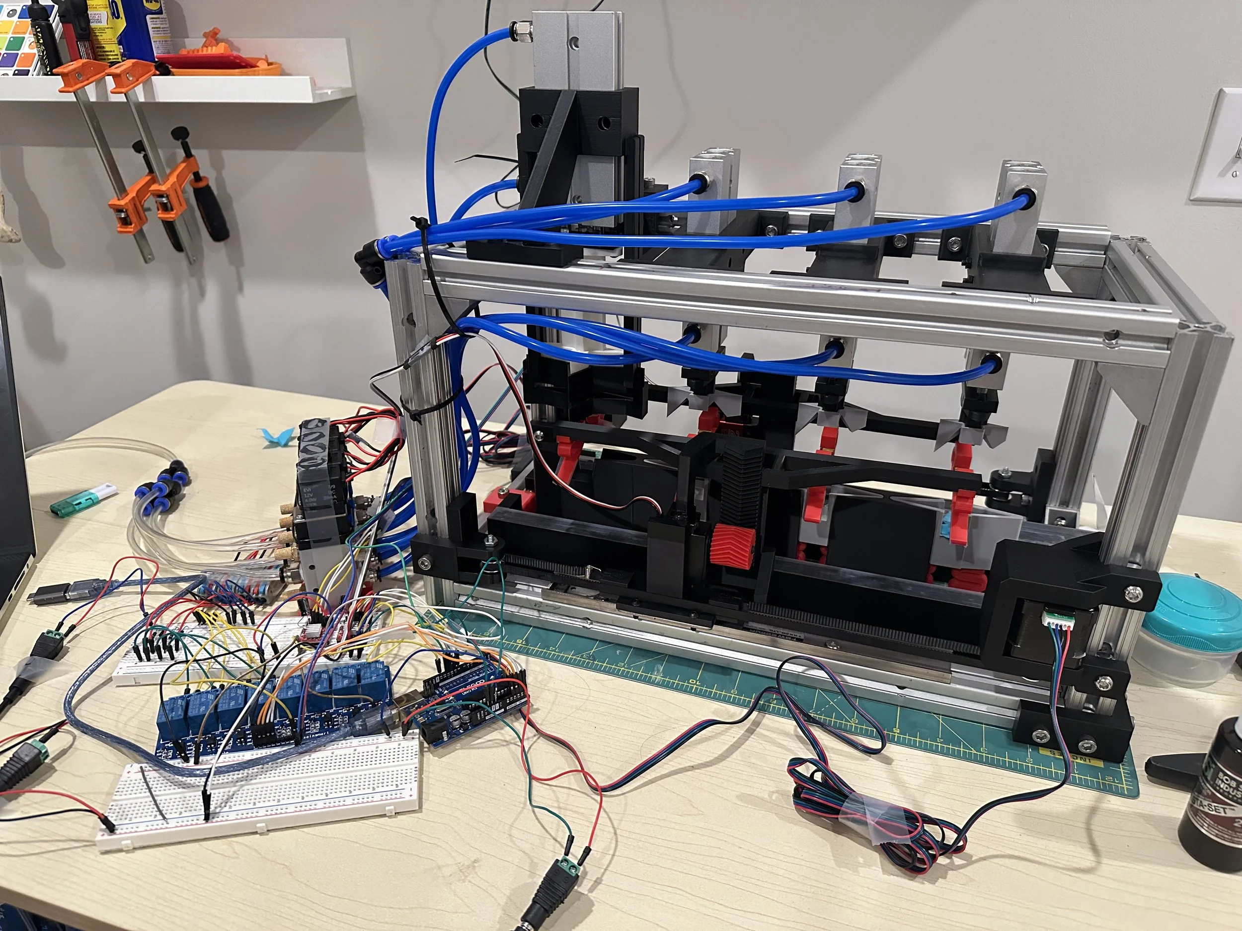 Seperate 5V-2A supplies power the servos. Relay board borrows ~300 mA from one.