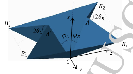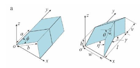 The crane is built with the two patterns below (waterbomb and miura-ori) and they interface in a such a way where they can be modelled pretty much exclusively with the topmost equation to the right of the images. To change how folded the crane is, just change theta.